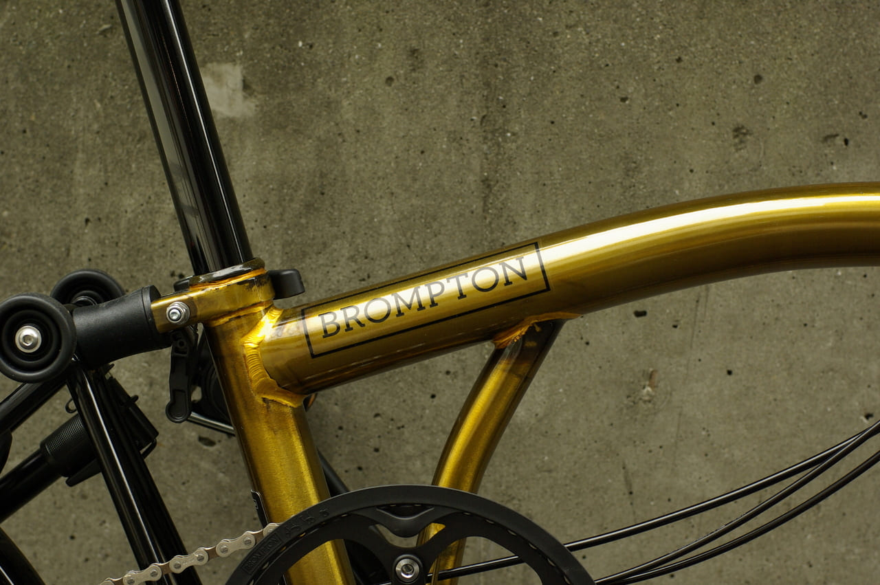 左)少々分かりにくいのですが、ユニオンジャックの赤色部分にはリフレクターが織りこまれています。中)メインフレームのBromptonロゴにもユニオンジャック柄が。右)BROOKSのB17サドルはブルー。派手になり過ぎず、好印象です。