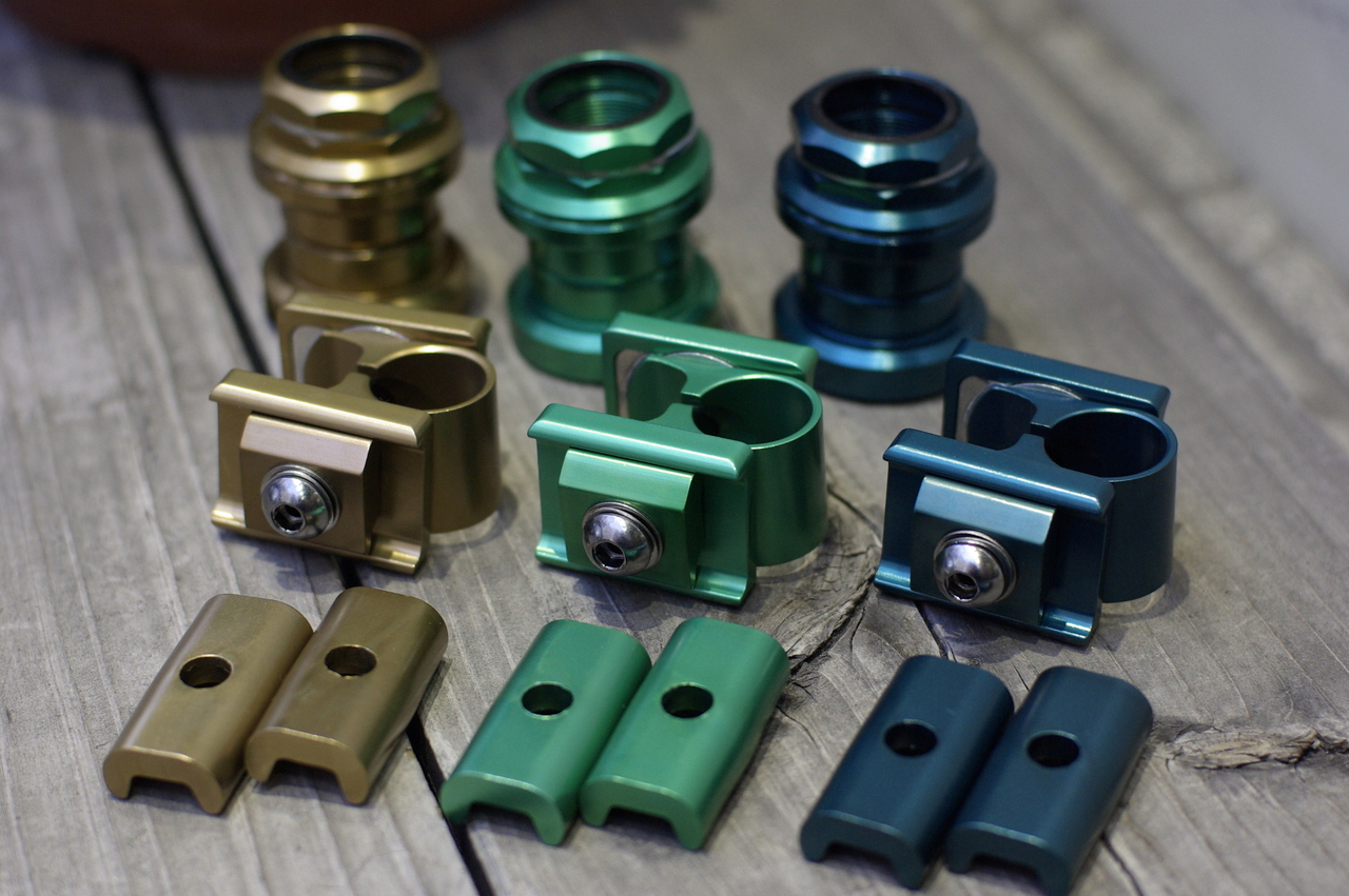 取り急ぎ工場より最終製品の画像が届きましたので、ご紹介がてらUPいたします。今回はBrompton用【8mmシャフト/28穴】として、シルバー、ブラック(限定)、チタニウム(限定)の3色、DAHON用【9mmシャフト/20穴】でブラックを生産。Brompton用にはSchmidtの純正スキュワー、DAHON用にはクイックリリースが付属いたします。