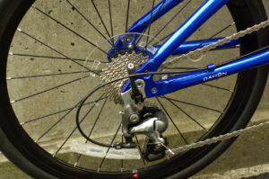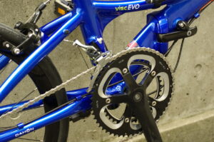上にも記しましたが、2×10段の駆動系。シマノTiagraをベースに構成されております。ギア比の関係で、シマノ純正のクランクではなく、社外製品が用いられておりますが、必要十分以上の性能で安心。ワイヤーの取り回しも折りたたみ時に支障のないように考慮されております。