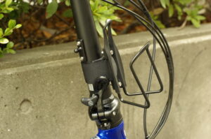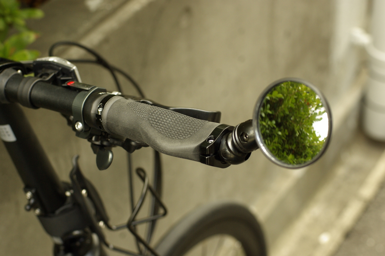 フレーム中央部分にはボトルケージ台座がございますが、そこへはLEZYNE製の携帯ポンプのみを装備。ボトルケージは、Bikeguyの製品でステムへマウント。この位置ですと折りたたみにも差し支えません。同じく、右グリップに追加したb&mのミラー。台座はしっかりとしたアルミ製、肝心のミラーはガラス製ですので平滑性に優れ、はっきりと見やすい製品です。