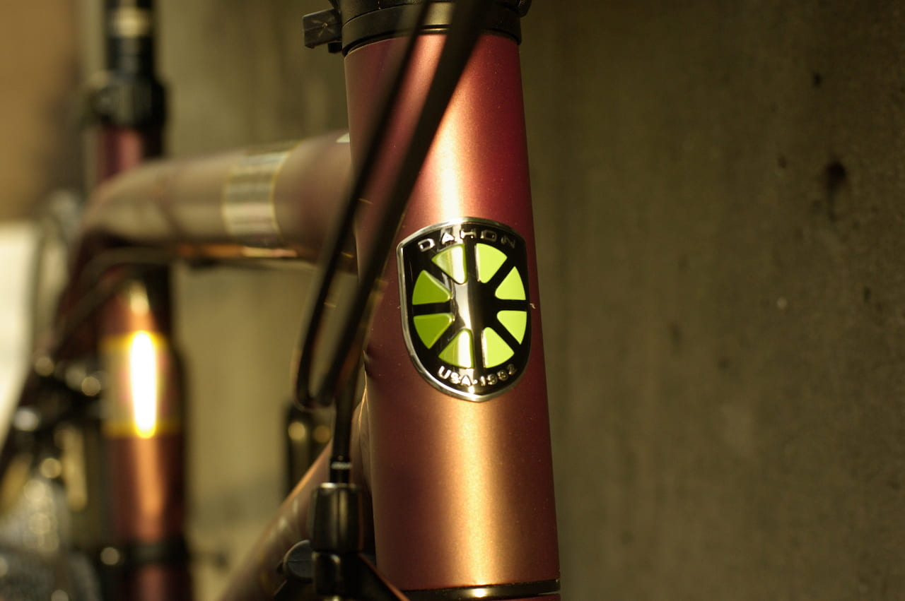 ヘッドチューブやフロントフォークは極太のパイプで構成されており、シンプルな造形ながら、剛性の高さを感じさせる、独特な雰囲気です。