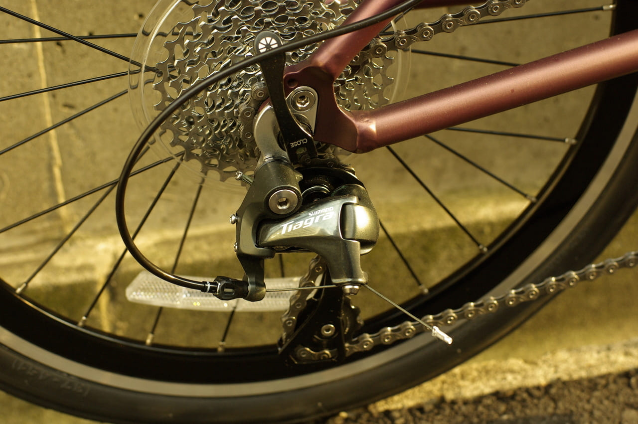 ハンドルステムは突き出し長35mmのVROステムを装備。ポジション変更には六角レンチが必要ですが、付属の工具をハンドルバー内部へ収納することも可能ですよ。駆動系はシマノ製Tiagraを用いた10段です。