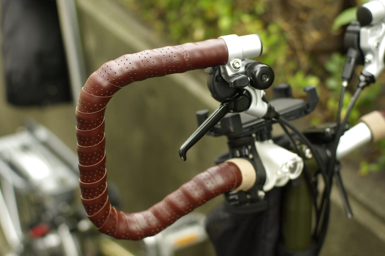 ハンドルバーは当店に限らず定番となっております、Veno セットインライザーバー。Brompton純正グリップの幅へあわせてスペースを開けてセッティング、各ワイヤー長さを合わせております。