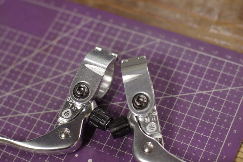 そこで、ブレーキレバーのバンド部の干渉箇所を棒ヤスリにてゴシゴシと削りました。本来でしたら溝を掘る格好にしたいところですが、バンド部の強度低下も気になりますので、このくらいに。
