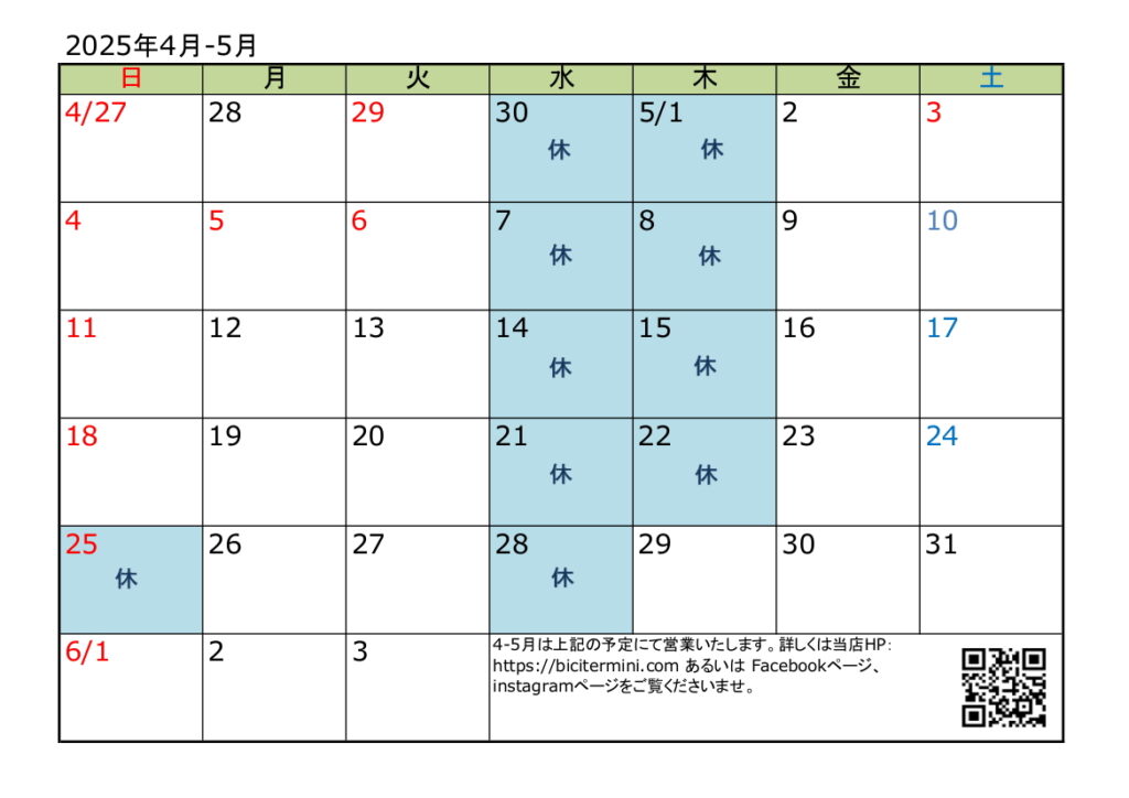 2025年5月の予定です。 投稿日 2025 年 5 月 2 日 更新日 2025 年 6 月 2 日 著者 店主:宮崎 カテゴリー ご連絡 - シェア - ツイート - LINE 平素は格別のご高配を賜り、厚くお礼申し上げます。 5月の予定を以下に記します。・5/25【日】・・・ 休業いたします。 ・5/29【木】・・・ 上記25【日】の代替営業です。ご来店の際には、下記の営業カレンダーをご確認くださいますよう、よろしくお願いいたします。何かとご不便、ご迷惑をおかけいたしますが、ご理解賜りますよう、お願い申し上げます。 - シェア - ツイート - LINE