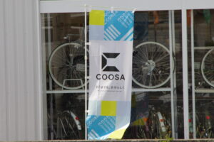 そして、反対車線にあったサイクルベースあさひオリジナルクロスバイク「COOSA」ののぼり。どこかで見たような四角っぽいマークがありますね、、、正方形っぽいマークとその下方に位置するブランドロゴ、、、。