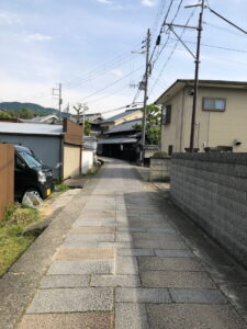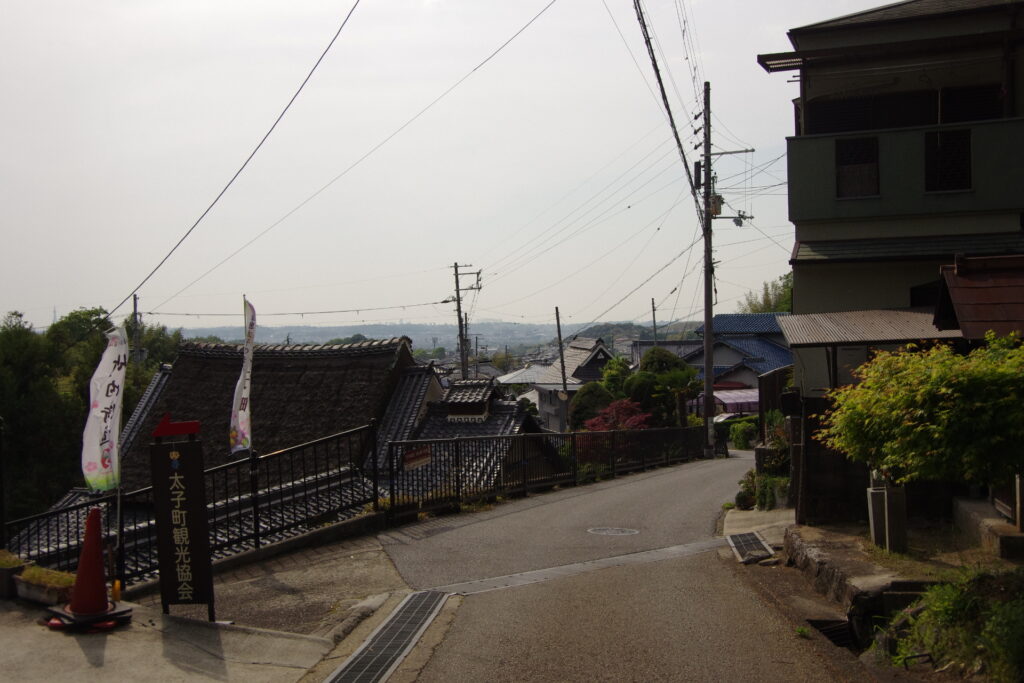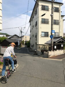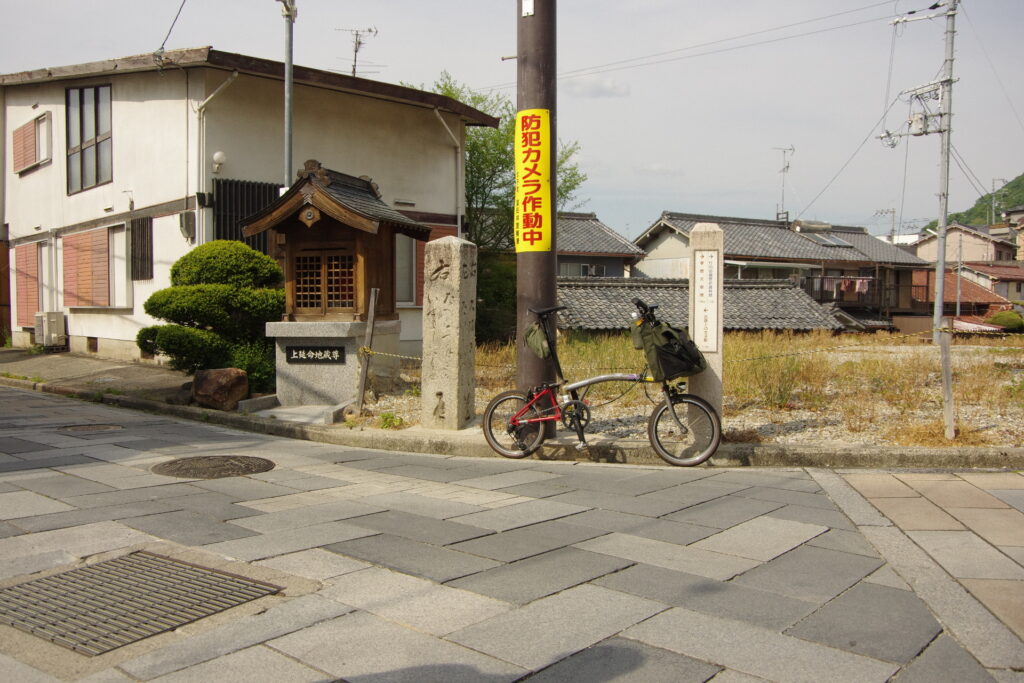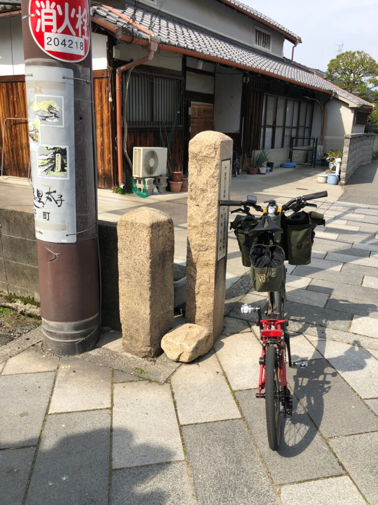 しばらく快走したところで、竹内遊歩道へ入ります。ほぼ並行して水路が張り巡らされており、家屋の裏手から降りることができる構造になっているようで興味深いです。さらに常夜灯や道標をチェックしながら、昔の面影を残す町並みを下ります。