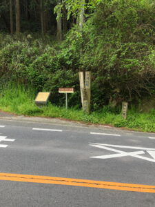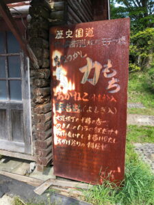 グイグイと登って行くと、別の道標も発見。そのまま国道166号へ合流し、自動車が行き交う中ギシギシと登って行き、二上山万葉の森レストハウスにて小休止。小さな小屋の横には錆びた看板。どうやらここで名物の力餅を販売していたようです。さっき見かけた「餅屋」は昔々のことでしょうけれども、場所を変えつつも、名物として存続していたのですね。そのまま一気に登ると、ついに竹内峠のピーク!