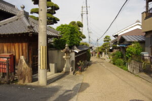 大きな山車倉庫。となりのお寿司屋さんのたたずまいが素敵。そしてここから目と鼻の先にある大きな道標。「左 大和路 右 大坂 すぐ さかひ」の表記。ちょうどスクーターが進んでいく方向へ進むのですが、ここを右に曲がると東高野街道です。