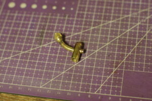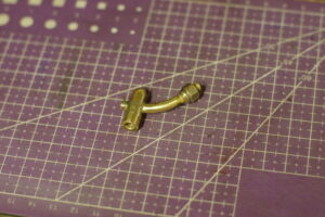 台座そのものは真鍮棒を切削し、ロウ付けにて製作。特徴的な曲げ部分はリフレクターを組み付けた際に水平になるようにバーナーで炙って曲げています。車体への組み付け部分はネジを切っていますので、角度を合わせてナットで固定するようにいたしました。完成後、クロームメッキを施しております。