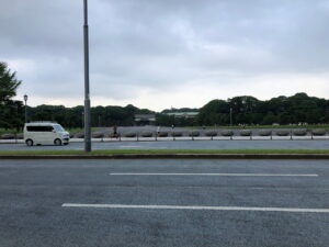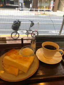 国会議事堂前。結構な高低差があることを初めて知りました。その近くには紀伊国坂。じわりじわりと登ります。ちょっと開始時間まで余裕がありましたので、見つけた喫茶店にてモーニング。自転車が見えるカウンター席で安心ですね。