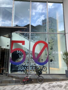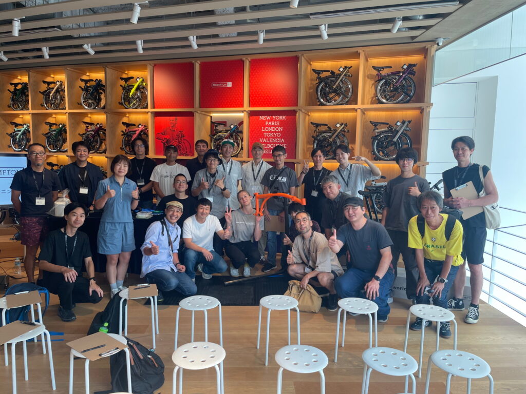 信号待ちで見つけた格好良いマンション。時間に余裕がありましたので、以前呼んだ永井荷風の書籍に出てきた「内藤町けやき公園」へ立ち寄りました。新宿区だとは思えない、とても静かな地域。とても良い雰囲気を味わうことができました。Brompton Tokyoはそこから目と鼻の先。Bromptonは折りたたんで、会場に持ち込ませていただきました。会場では雑誌等でお見かけしたことのある方々がたくさん!Brompton Japanのスタッフさまとはメールでのやり取りは行っていたものの、実際にお会いしてお話してみると、皆さん非常に丁寧で熱量の高い方ばかり!テンションが上がるのを感じます。
