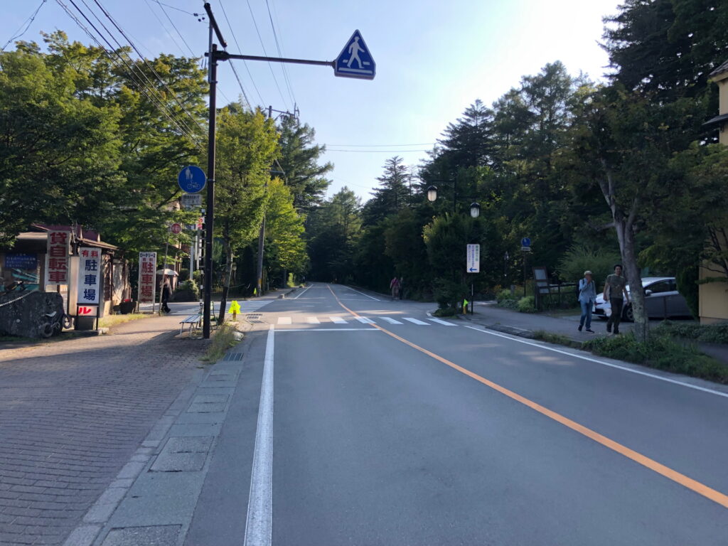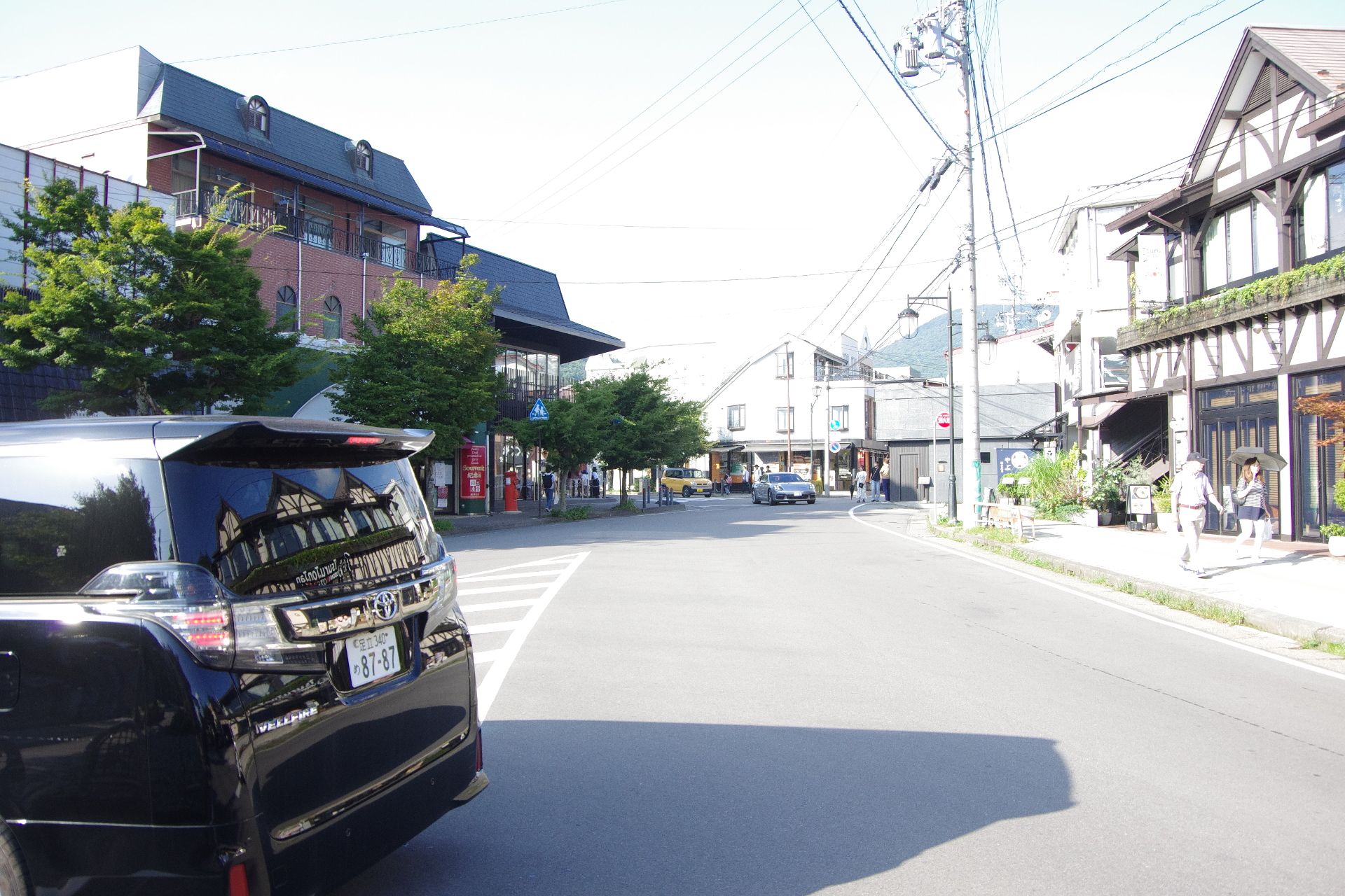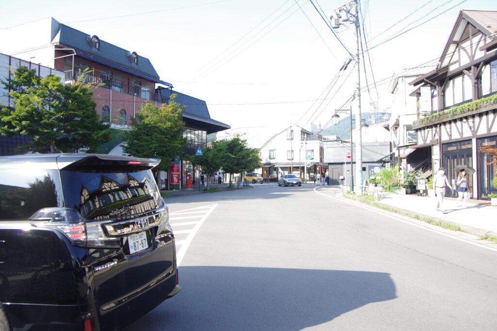 ということでここから再開です。前回はこの画像の中央奥側からやってきましたので、ちょうどヴェルファイアが向いている方向が中山道、ここから西方向へ進む格好です。軽井沢駅はこの丁字路の南側に位置しています。