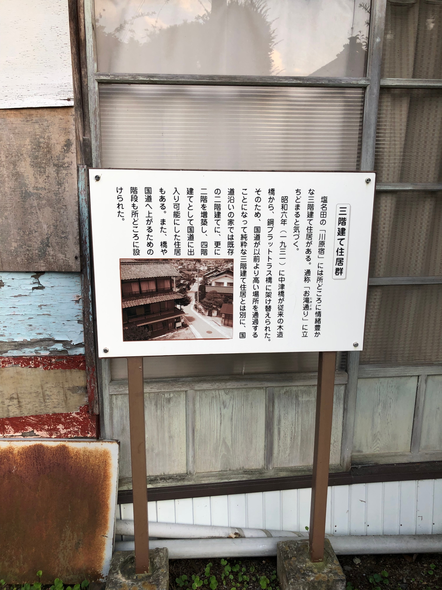 古物商でしょうか、ハイゼットの消防車が埋もれています。これまた古いたばこ屋さん。そのすぐ近くには問屋本陣が残されています。この先には千曲川があり、そこまでが塩名田宿です。