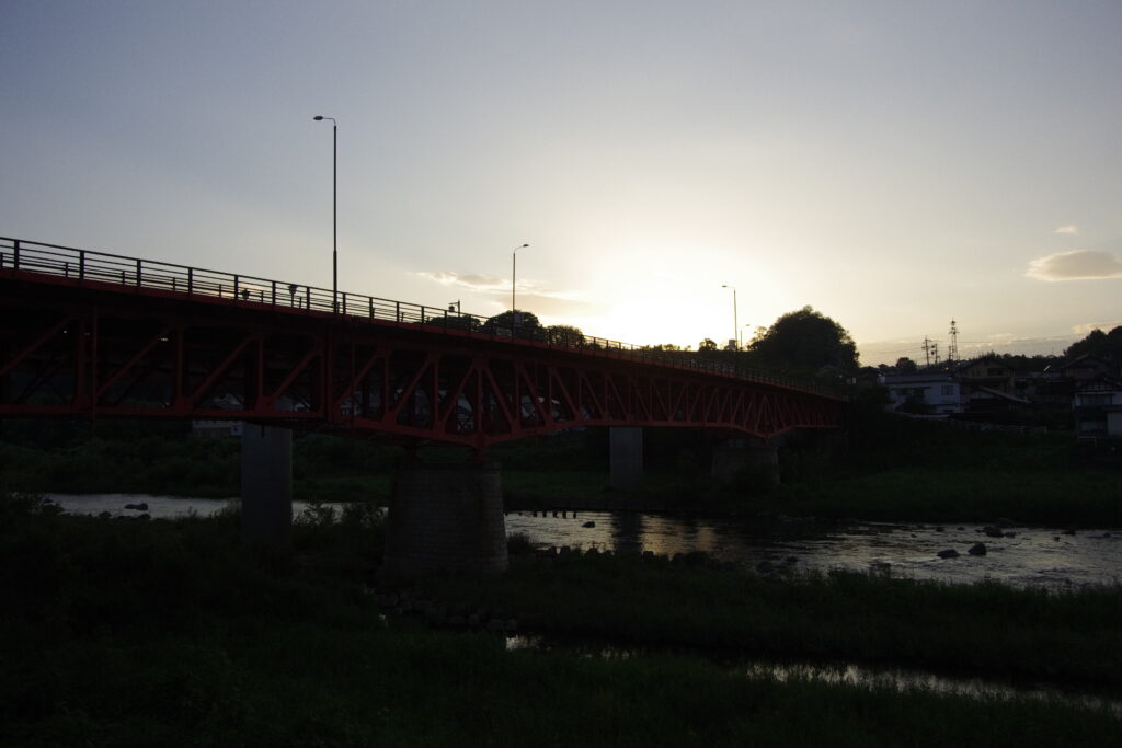 逆光になってしまったので見えづらいのですが、赤いトラスが美しい中津橋。これを渡って千曲川を越えます。