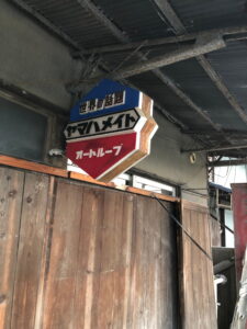次は八幡宿。途中に見つけた自転車・オートバイ店の看板。これもかなり古いですね。2ストロークエンジンの分離給油が画期的だった時代でしょう。