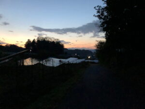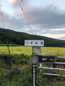 急勾配を一気に抜けて、草の生い茂る未舗装路を一気に登ると、望月宿の灯りが。実際にはまだまだ先で、この先の瓜生峠を越えると望月宿です。