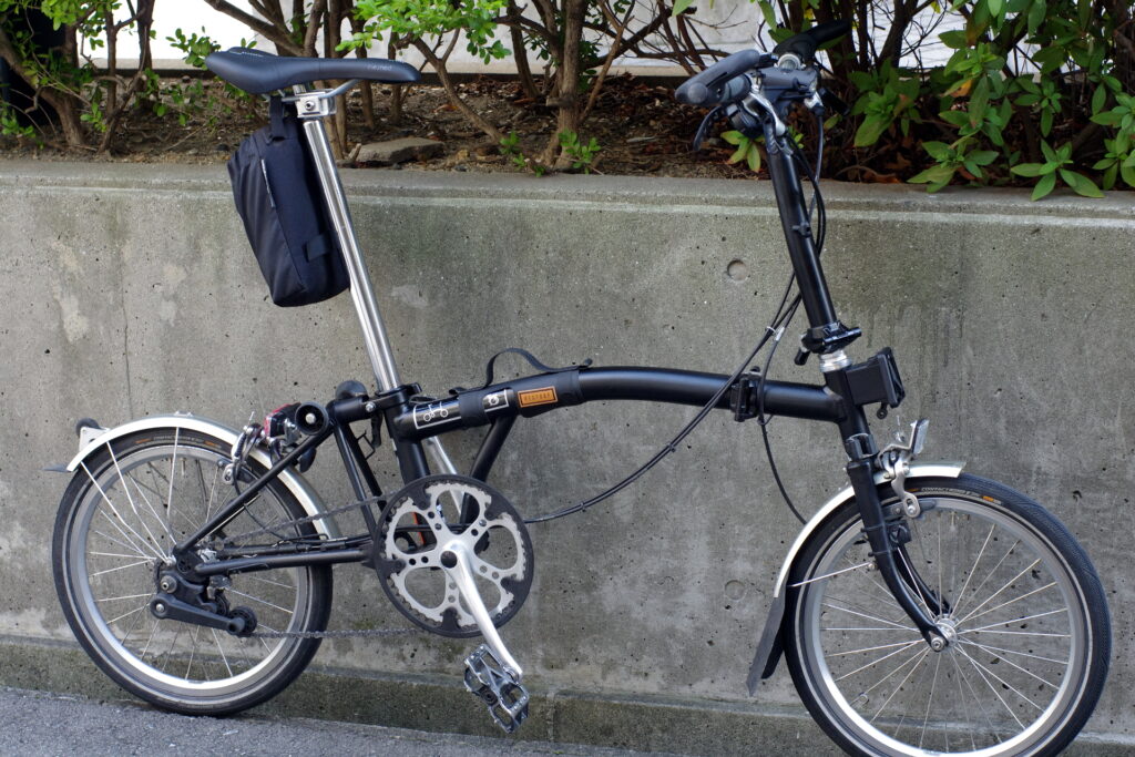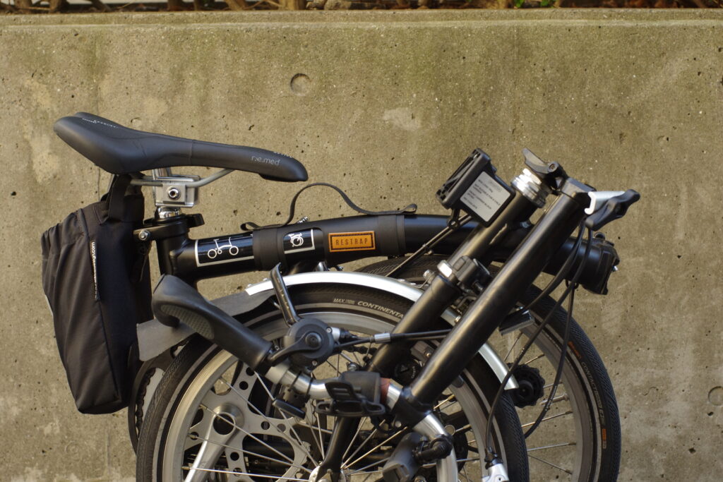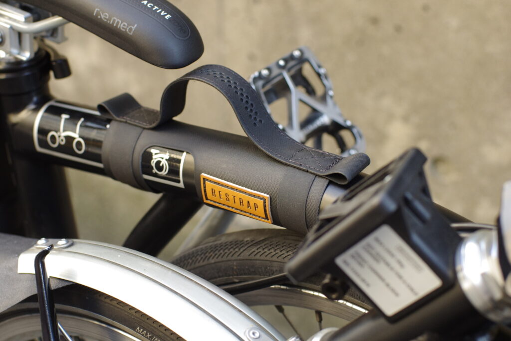 Bromptonのメインフレームへ取りつけて、輪行などの持ち運び時に便利な持ち手となるストラップです。持ち手部分があることはもちろん、両端にはループがあり、付属のショルダーストラップで肩掛けも可能です。これまでも類する製品は複数ありましたが、ほとんどの製品で持ち手部分の位置が悪く、車体を持ち上げた際に傾斜してしまい、歩く際に足へ干渉するのがとても気になってしまっておりました。しかしながら、この製品はメインフレーム下部の筋交い部分付近(=車体の重心付近)に持ち手があるため、車体を垂直に持ち上げることが可能です。