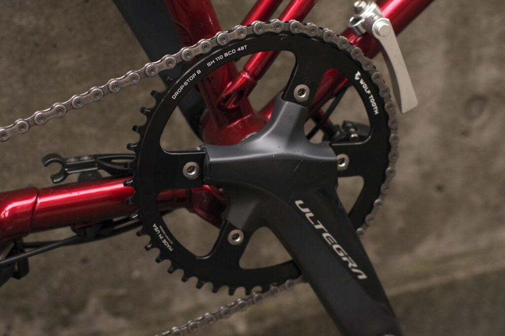 とは言え、そこまで難しい作業ではございません。チェーンリングをWolftooth製品(48T)へ交換し、変速と折りたたみ機構を調整いたしました。