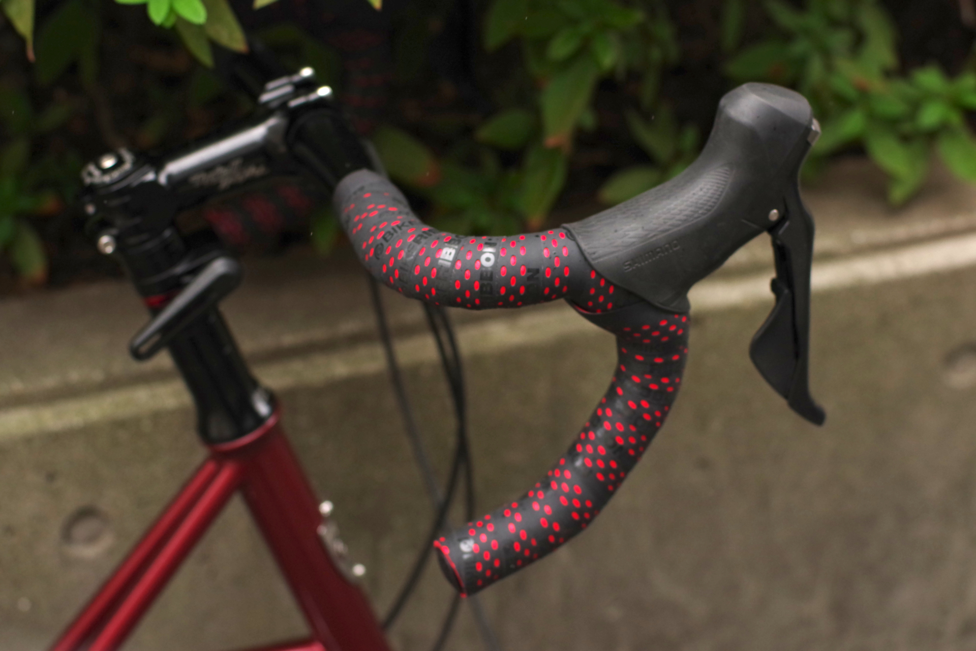 左側のSTIレバーはシフトワイヤーを抜いてしまう格好となりますので、バーテープも交換です。今回はバイクリボンのドロップス。車体カラーと合わせております。この度はありがとうございました!