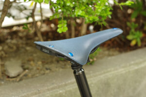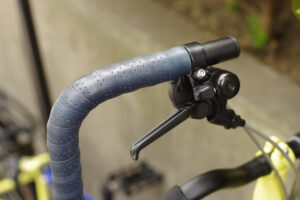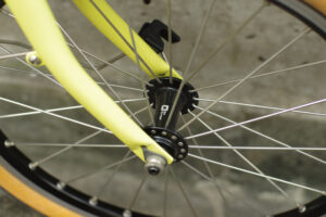 左】バーテープはBROOKSのレザー。純正のPハンドルをブラックアルマイトにて着色。ハンドルバーシムもズレ防止のため接着済み。右】リムはアイレット付きのWウォール。スポークはSAPIM、フロントハブは当店オリジナルハブ製作当初の試作品です。製品版よりも大径のベアリング、フランジも大きめです。