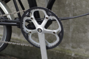 左】ヘッドパーツは定番のTANGE FL270C。フロントハブも分解洗浄後に再組み立て。右】チェーンリングは新品へ交換、固定ボルト類は錆取り→防錆処理後に再組み立てを行いました。これでまたバリバリとお使いいただけることと思います。この度はありがとうございました!