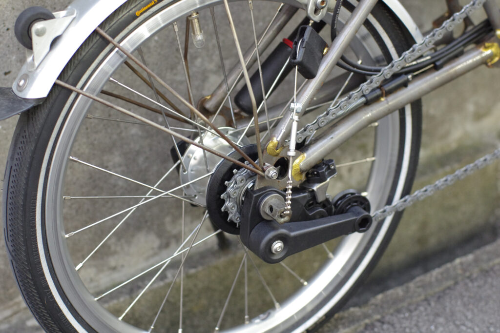 先日の作業です。以前にオーバーホールを施工させていただいて以来、改めてサイクリングを楽しまれているとのことで、これまでのBSR内装3段ハブをBWR内装3段ハブへ交換、外装2段を追加して、6段化をご依頼くださいました。長期にわたって生産されているBromptonならではのカスタマイズです。