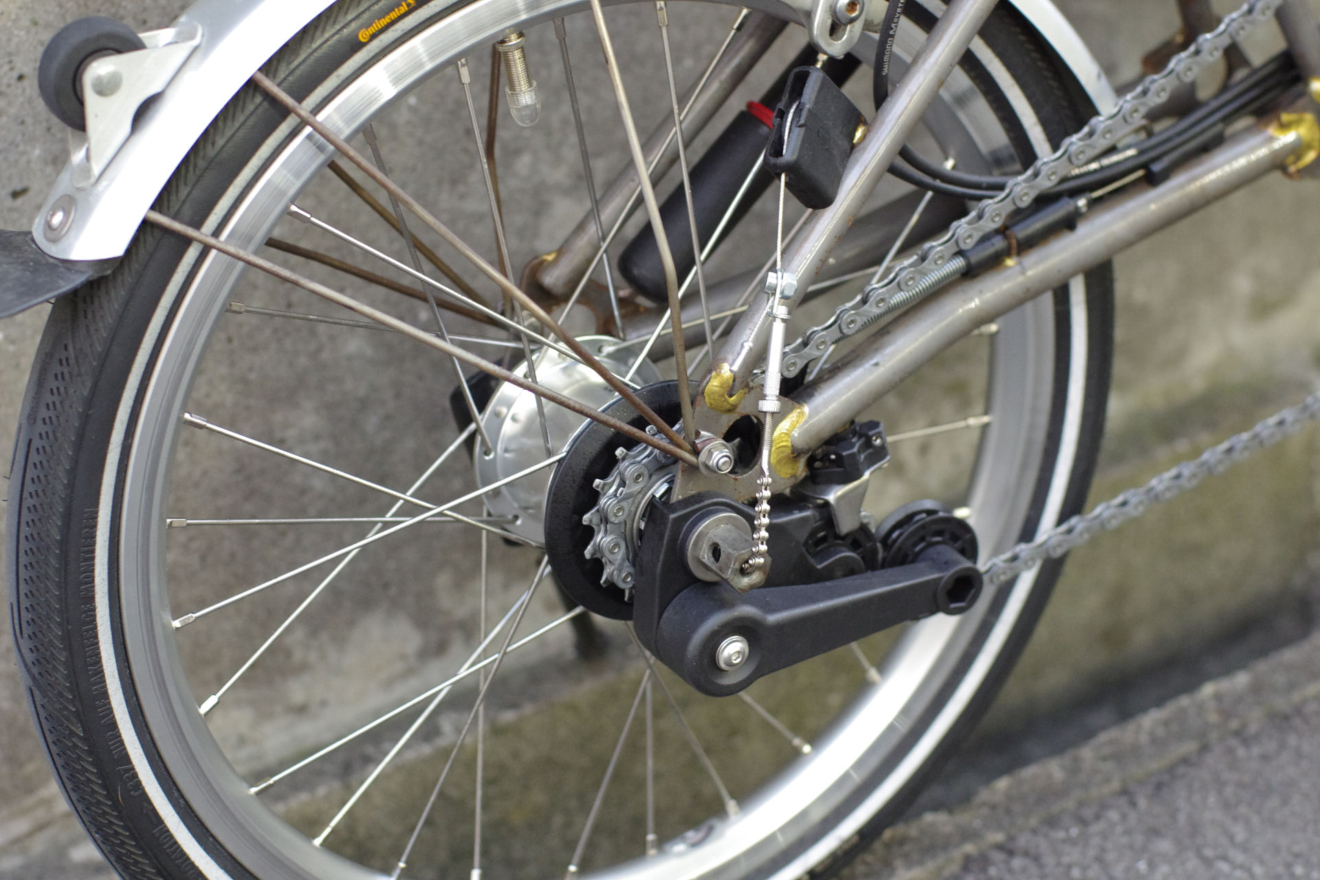 先日の作業です。以前にオーバーホールを施工させていただいて以来、改めてサイクリングを楽しまれているとのことで、これまでのBSR内装3段ハブをBWR内装3段ハブへ交換、外装2段を追加して、6段化をご依頼くださいました。長期にわたって生産されているBromptonならではのカスタマイズです。