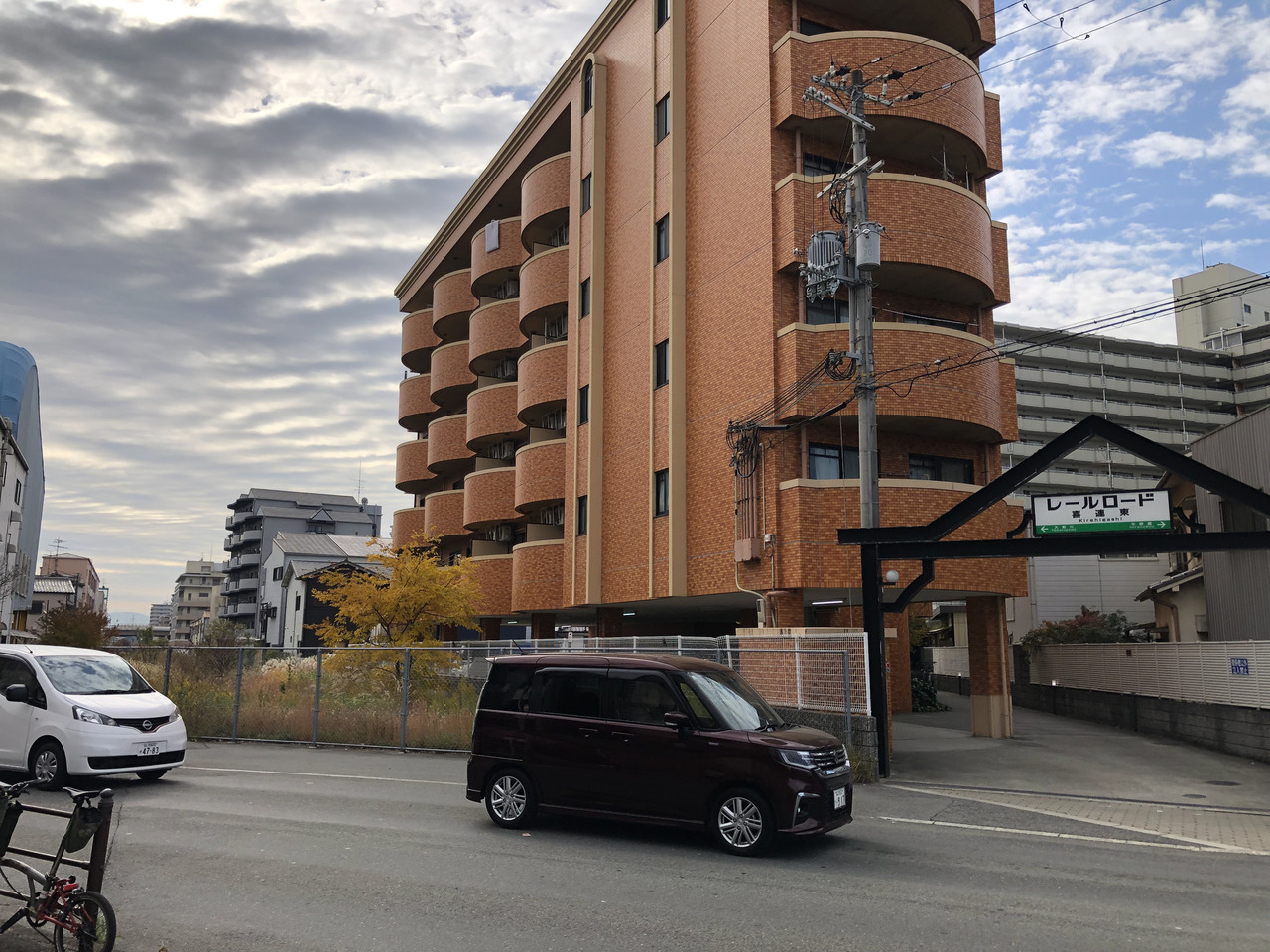 踏切跡横に建つマンションは「レールロード喜連東」JRの駅名票を模した表記がイカしていますし、線路に沿った建物形状も格好良いです。