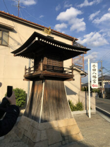 そのまま南下すると、結構な大きさの木製常夜灯。鳳凰が鎮座しており格好良いです。ちょっと裏通りに入ると、西琳寺前に発見した道標。ちょっとこれは判読が難しかったですね。