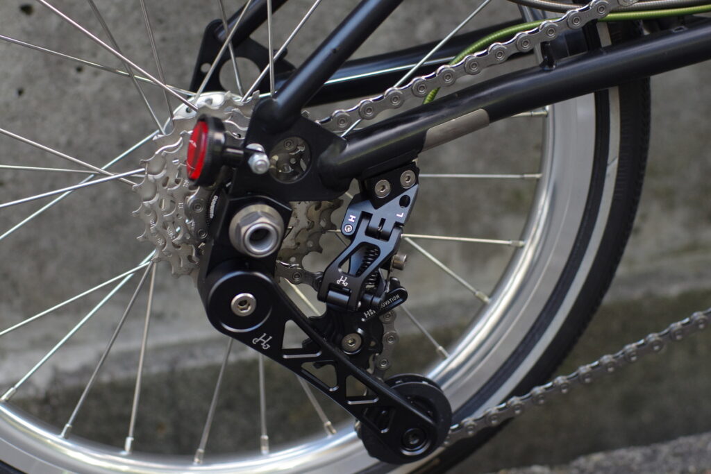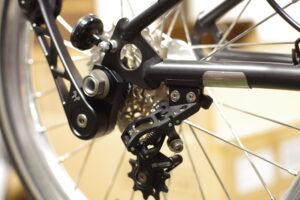 先日の作業です。お客さまよりご依頼を受けて、Brompton C Lineの車体を外装5段化いたしました。車体とディレーラー、テンショナーをお持ち込みの上、当店にてリアホイールをご用意させていただき、それらを組み合わせて適切に動作するように加工、調整を行いました。
