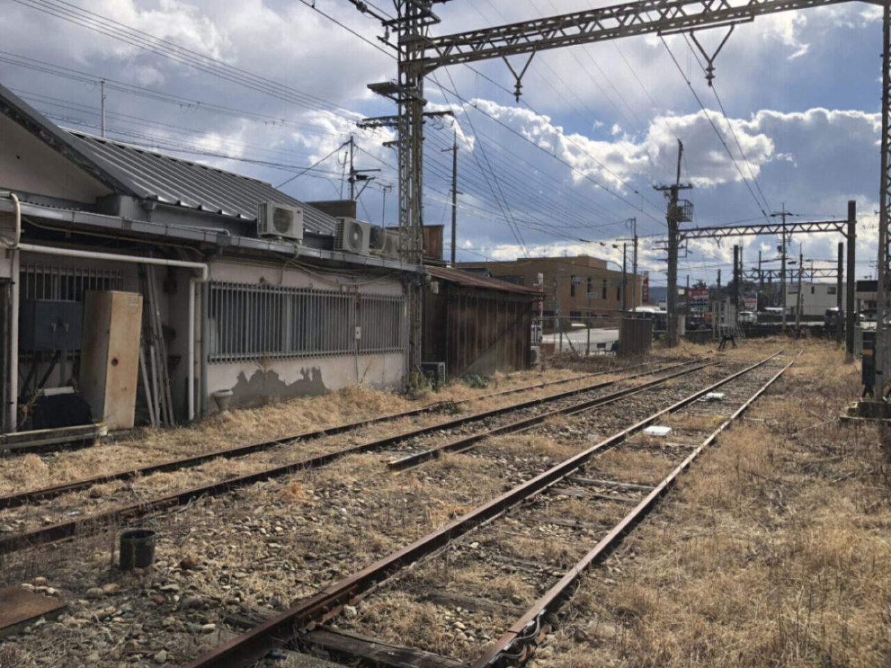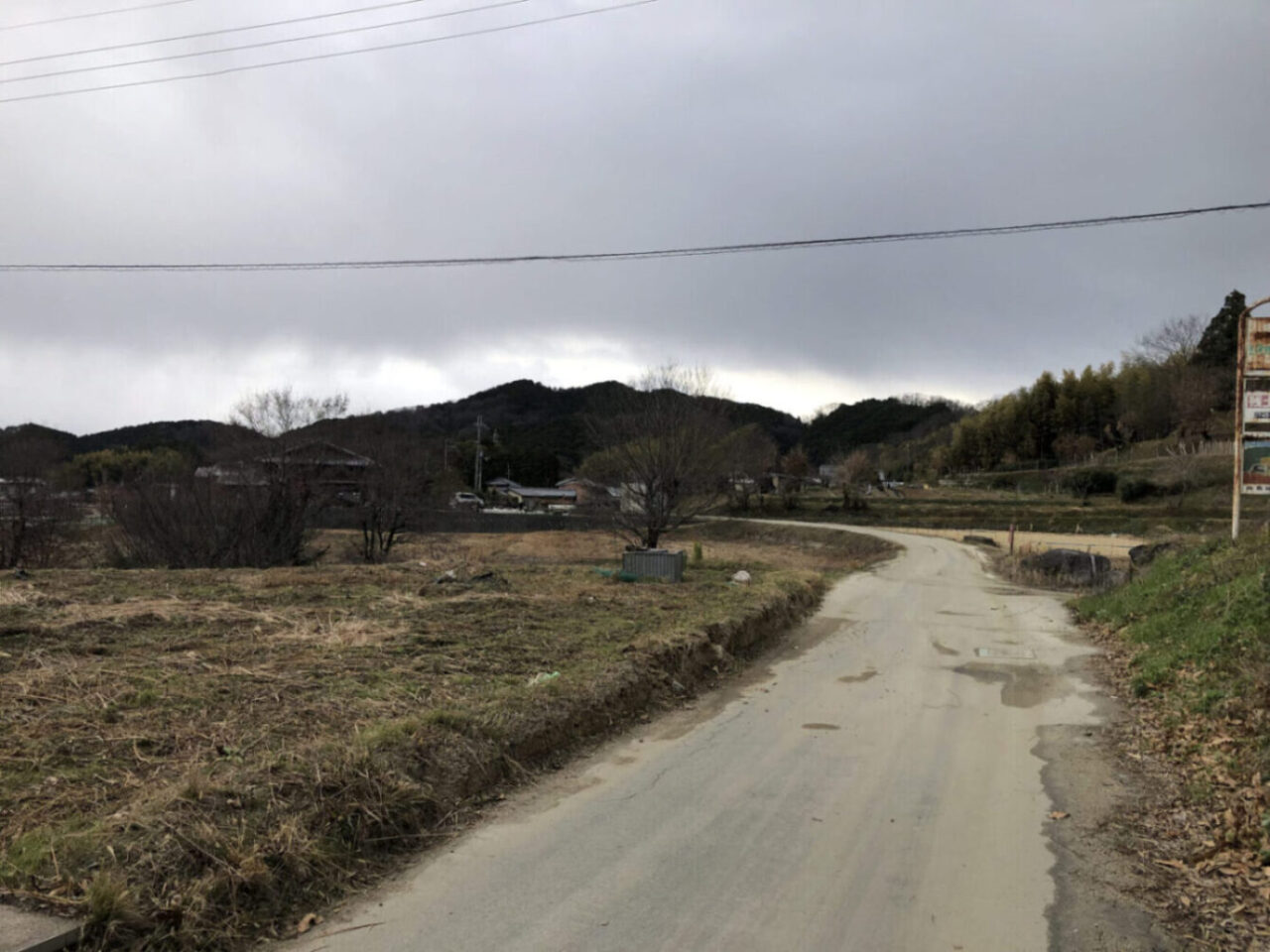 冬ならではの彩度の低い風景。走行しているのは舗装路なのですが、すぐ横の残土処理場から持ち出される土砂で路面の色が変わったおかげで、昔の道を走っているような気分になります。