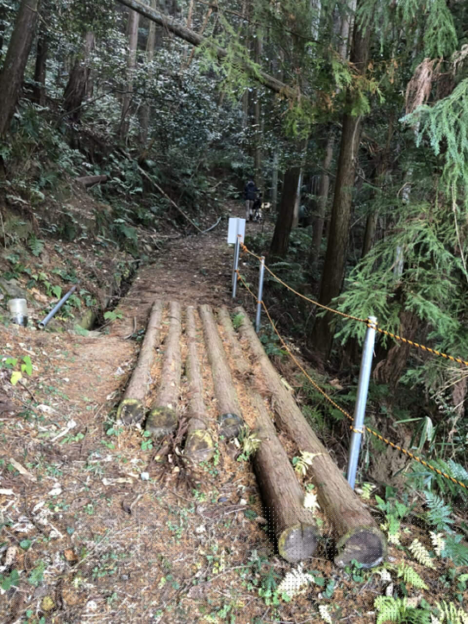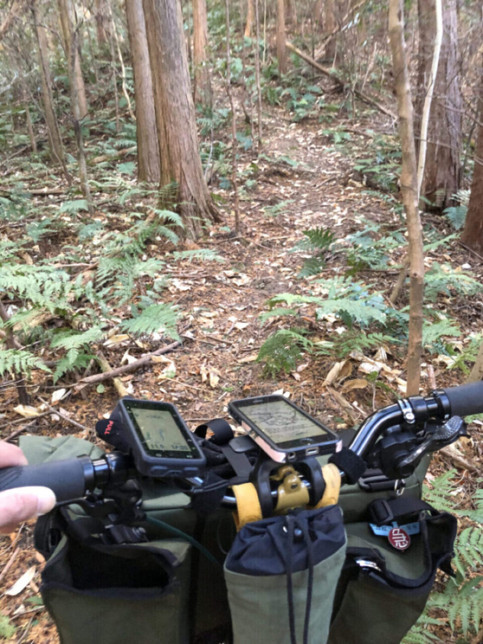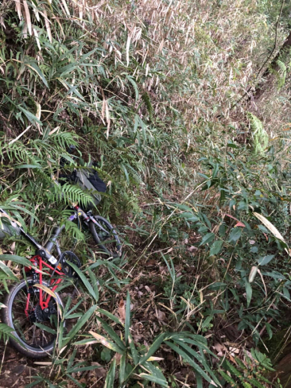 丸太橋を渡ってから、山頂までは全く乗車できず延々と担いで登るということに。ほぼ苦行でしたが何とか到着。山頂でちょっと休憩してから下りますが、今回同行くださったお客さまは慣れていないせいか、ほとんど押して下っておられました。