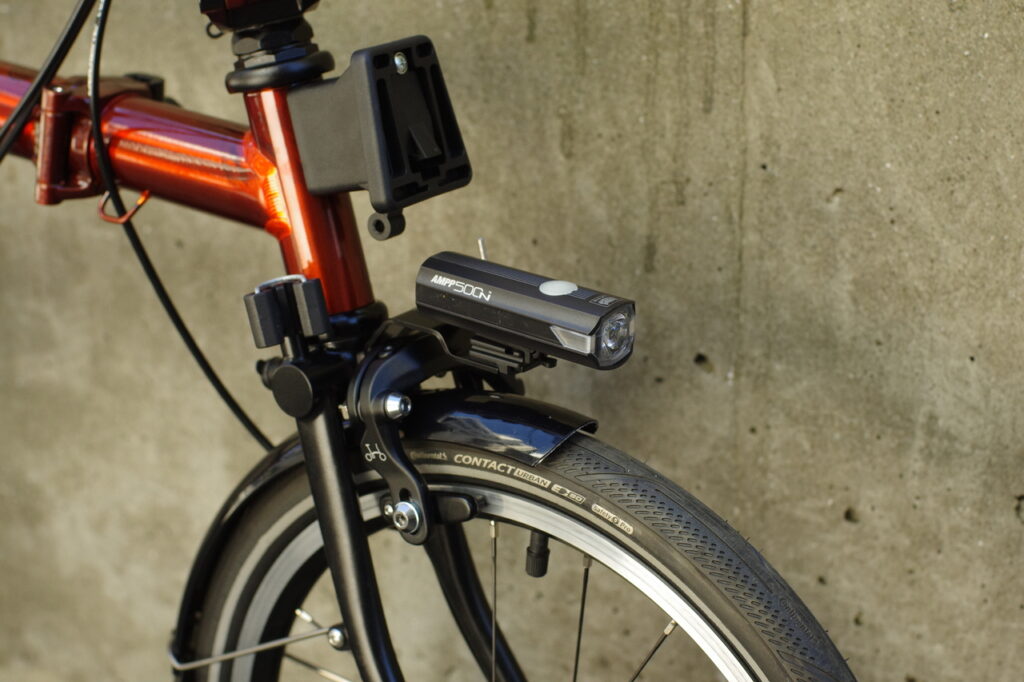 定番のミノウラ製ライトステー、CATEYE製のヘッドライトAMPP500Nを追加装備。夜間走行も安心です。