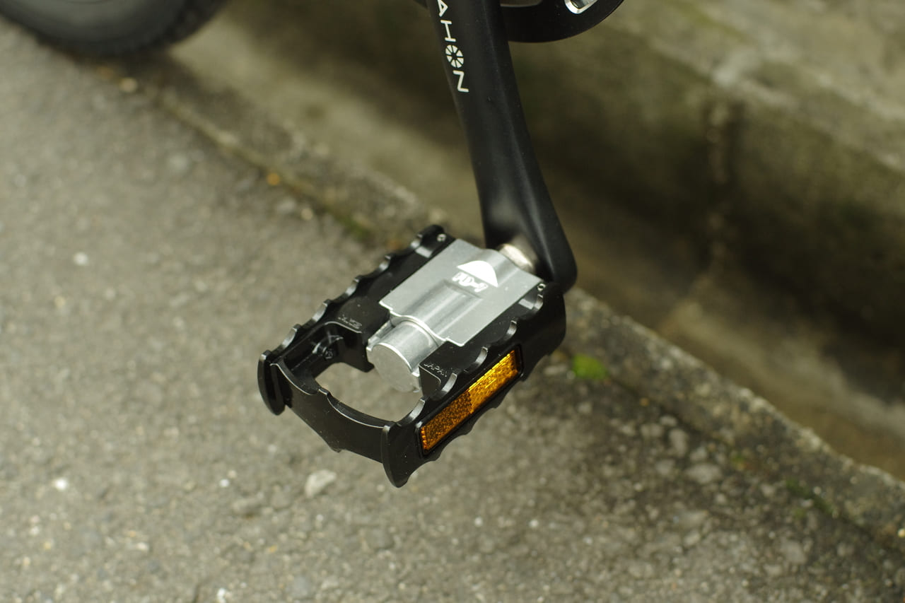 純正標準のペダルはごく一般的なものですので、やはり折りたたみ時にはちょっと邪魔になってしまいます。今回はMKSのFD-8ペダルへ交換いたしました。折りたたみ式ペダルとしては回転性能が高く、耐久性も高い製品です。