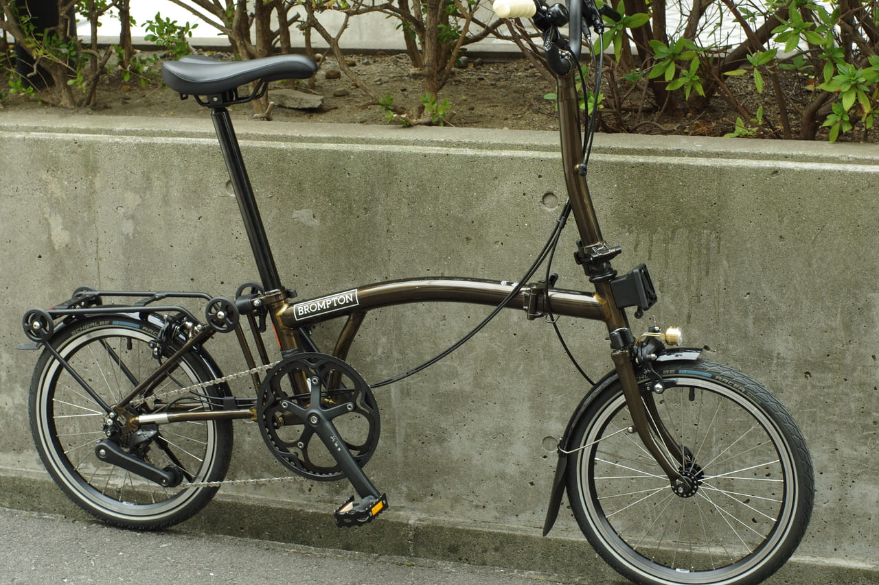 先日の作業です。先日ご依頼いただいていたBromptonのC Lineブラックラッカーを納車整備いたしました。また、お客さまのご要望から、先日入荷のKiLEY製真鍮コレクションのヘッドライトを組みつけ。今回は真鍮材からステーを製作してみました。