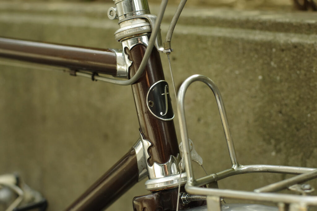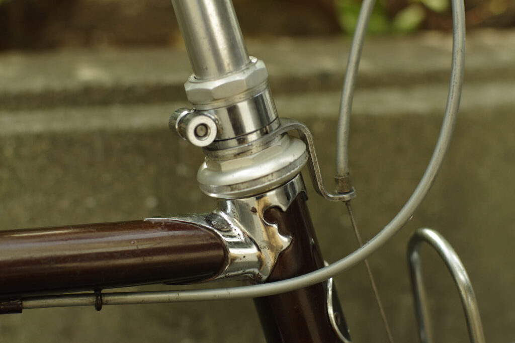 さらに、ハンドル着脱には側面のボルトを緩めるだけで着脱が可能。約40年前の車体とのことですが、輪行における分解・復元を容易にするための工夫が随所に盛り込まれています。ラグ形状も素敵です。
